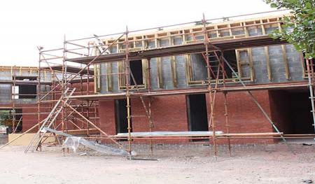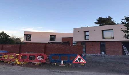 Scaffolding was quickly erected around the outer skin of Forterra's deep red-faced brickwork (Clockhouse mixture). Floor joists and floorboards were fitted onto the internal thermalite block work within days giving a good solid first floor platform to work from. Before we knew it the rest of the facing bricks and internal thermal blocks were laid right up to the roof height and we were preparing to install the main house flat roofs.
