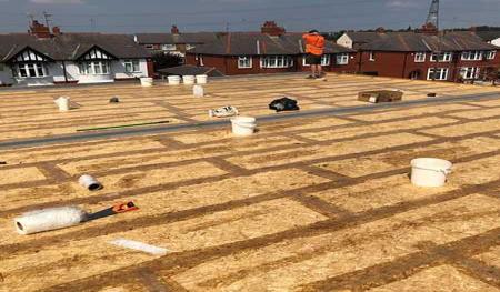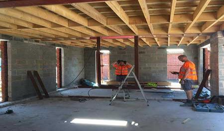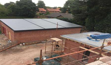 Scaffolding was quickly erected around the outer skin of Forterra's deep red-faced brickwork (Clockhouse mixture). Floor joists and floorboards were fitted onto the internal thermalite block work within days giving a good solid first floor platform to work from. Before we knew it the rest of the facing bricks and internal thermal blocks were laid right up to the roof height and we were preparing to install the main house flat roofs.