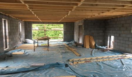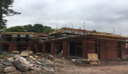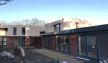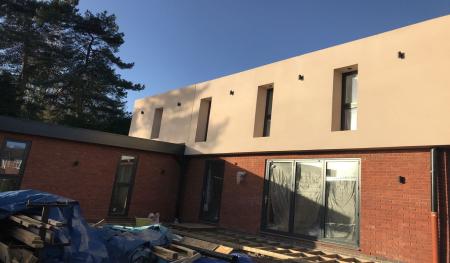Scaffolding was quickly erected around the outer skin of Forterra's deep red-faced brickwork (Clockhouse mixture). Floor joists and floorboards were fitted onto the internal thermalite block work within days giving a good solid first floor platform to work from. Before we knew it the rest of the facing bricks and internal thermal blocks were laid right up to the roof height and we were preparing to install the main house flat roofs.