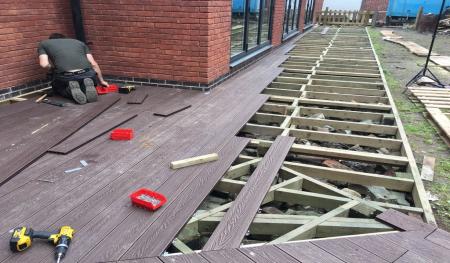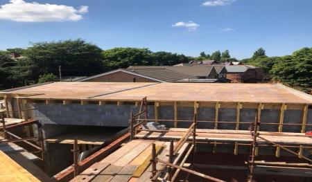 Scaffolding was quickly erected around the outer skin of Forterra's deep red-faced brickwork (Clockhouse mixture). Floor joists and floorboards were fitted onto the internal thermalite block work within days giving a good solid first floor platform to work from. Before we knew it the rest of the facing bricks and internal thermal blocks were laid right up to the roof height and we were preparing to install the main house flat roofs.